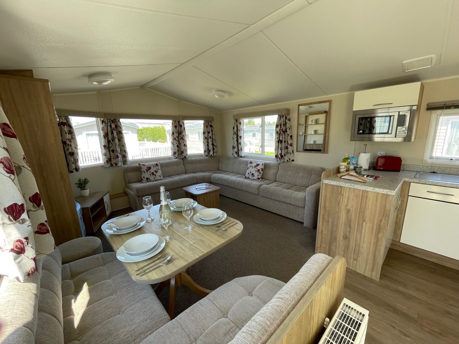 The 2018 Willerby Brockenhurst is a popular, modern static caravan featuring a stylish, open-plan layout. Key features include double glazing, central heating, freestanding furniture, an en-suite master bedroom, and a fitted kitchen with integrated appliances.
