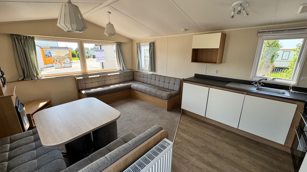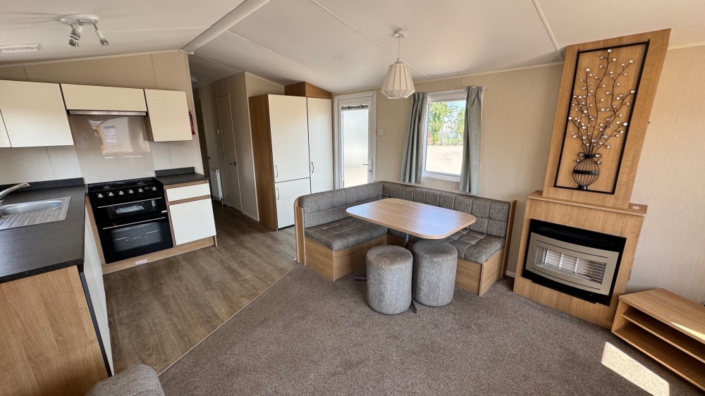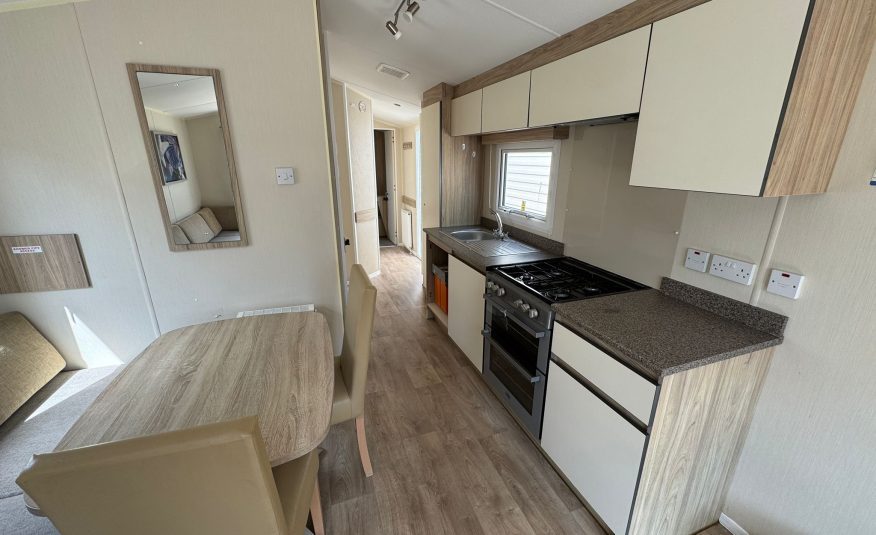 The 2018 Willerby Mistral is a 2 bedroom static caravan designed for family comfort, typically featuring double glazing, central heating, and an open-plan layout. It sleeps 2-4 people, featuring a master bedroom, L-shaped lounge seating, a gas fire, and a modern, well-equipped kitchen.