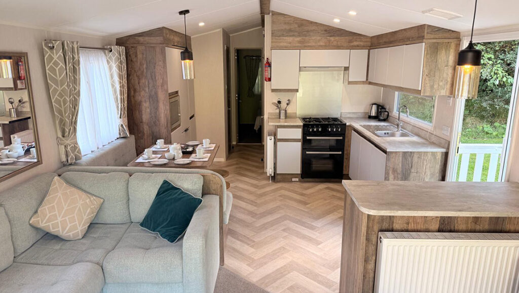 The 2021 Willerby Brookwood is a stylish, entry-level, 12ft-wide static caravan designed for families  with 2 bedrooms. It features a modern, open-plan layout with distinctive distressed wood accents, a breakfast bar, integrated appliances, and central heating as standard.