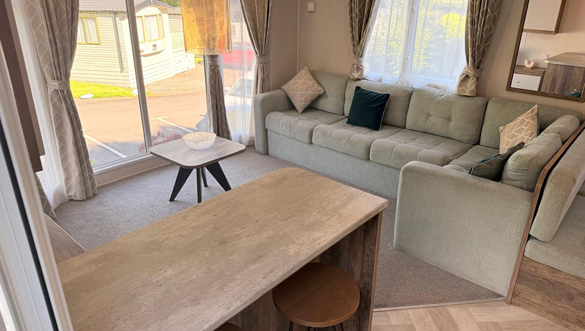 • Living Area: Open-plan lounge with L-shaped seating, electric/gas fire, and large windows.